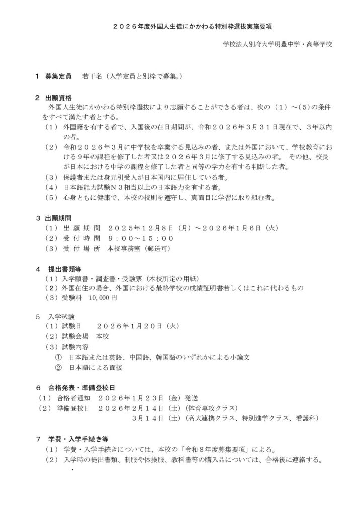 「2026年度外国人生徒にかかわる特別枠選抜」を別紙の内容にて実施します。 ご希望の方は、中学校を通じて本校にご相談ください。